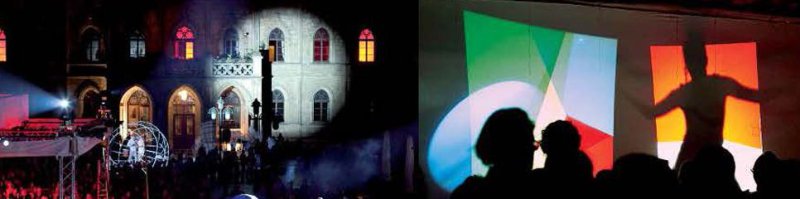 Das 1919 in Weimar gegründete Bauhaus war getragen vom Gedanken der vielfältigen Möglichkeiten der Gestaltung von Wohnen und Leben. Vor diesem Hintergrund verstand sich die Produktion des »rasenden Bauhauses« als gelebte Interdisziplinarität in einem soziokulturellen Schaffensprozess – und hob sich deshalb von zahlreichen hochkarätigen Ausstellungen und Veranstaltungen des Festjahres ab. Bespielte man in den vergangenen Jahren die repräsentative klassizistische Fassade des »mon ami«, wollte man beim »rasenden Bauhaus« erstmalig den Weimarer Marktplatz in seiner ganzen Dimension von Fläche, Raum und begrenzenden Hauswänden verzaubern und neu erfinden.